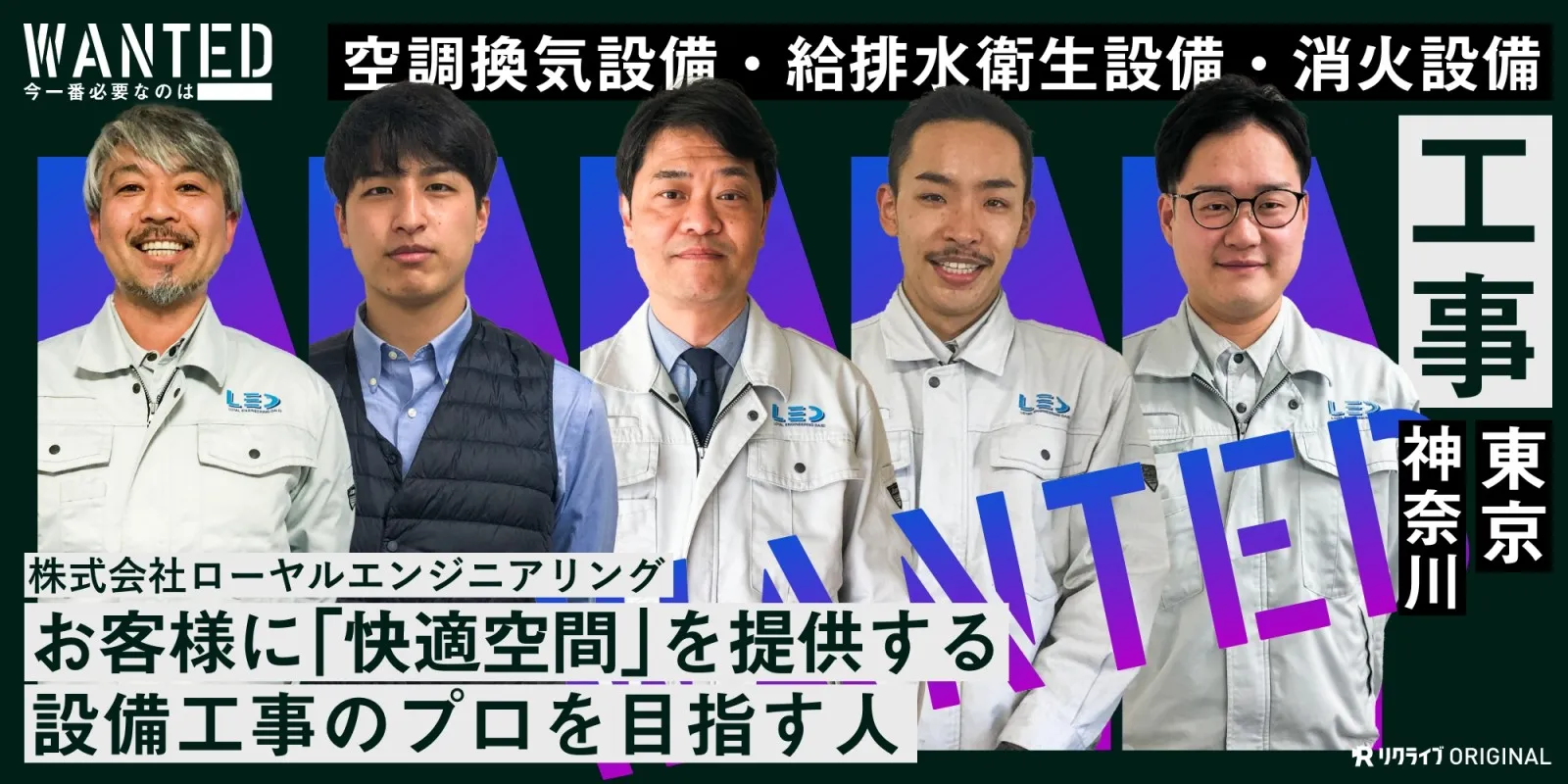 建物の中にいる人が快適かつ安全に過ごすため、給排水衛生、空調、換気、消火設備電気などは、どの建物にも欠かすことのできない設備です。私たちローヤルエンジニアリングは、こうした設備の設置・リニューアルを推進するプロフェッショナル企業です。未経験でも安心してスタートできる充実した教育制度と資格取得支援も整っています。